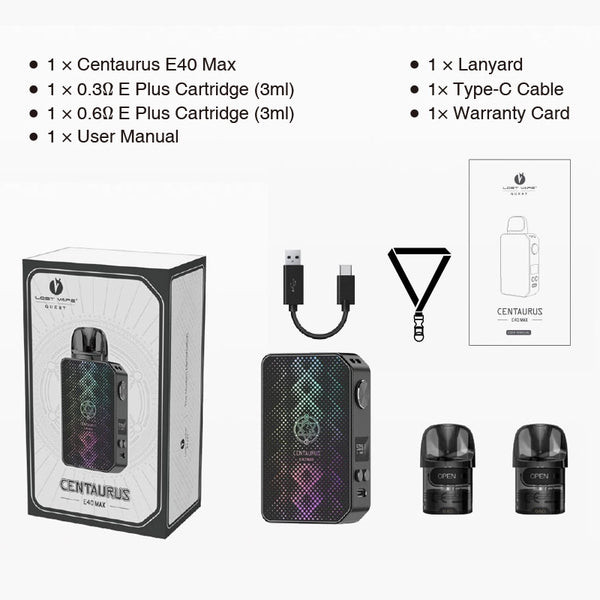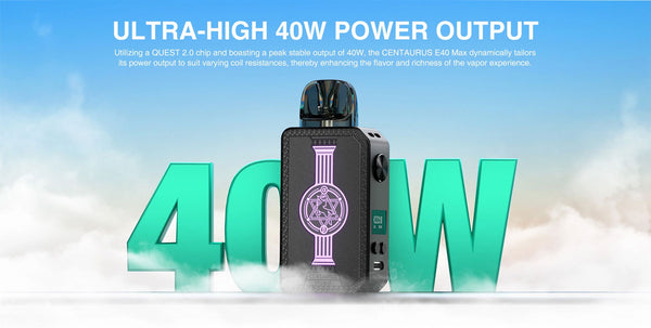 جهاز Lost Vape Centaurus E40 Max مزود ببطارية مدمجة بسعة 1400 مللي أمبير/ساعة، توفر طاقة قصوى قابلة للتعديل تبلغ 40 واط، مما يضمن تجربة تبخير عالية الجودة لأكثر المستخدمين تطلبًا. بسعة 3 مل، يتوافق Centaurus E40 Max مع خراطيش E-plus بمقاومة 0.3 أوم و0.6 أوم، مما يتيح للمبخّرين تخصيص أسلوب التبخير الخاص بهم حسب تفضيلاتهم.