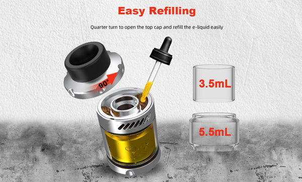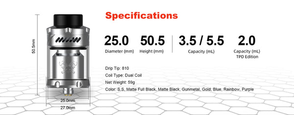 يتميز جهاز Hellvape Dead Rabbit 3 RTA بقطر 25 مم. مزود بغطاء بدون دعامات لتكوين ملفين، بسعة 3.5 مل من سائل التبخير، ويمكنك أيضًا اختيار كوب فقاعي بسعة 5.5 مل. يُقدم الجهاز نكهة مثالية وبخارًا كثيفًا بفضل تدفق الهواء من الأعلى إلى الأسفل، حيث يتم توفير تدفق الهواء العلوي من خلال فتحتين جانبيتين، ويوجه الهواء مباشرةً إلى الأسفل عبر شكله السداسي. عند فتح الغطاء العلوي، يدعم نظام التعبئة العلوي إعادة تعبئة السائل الإلكتروني.