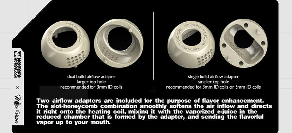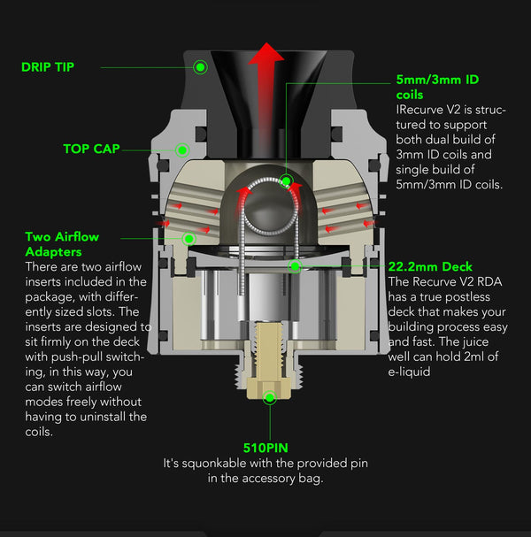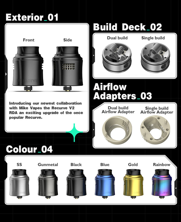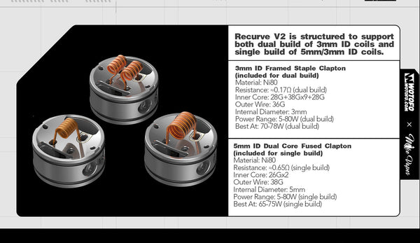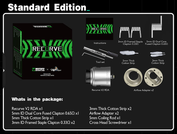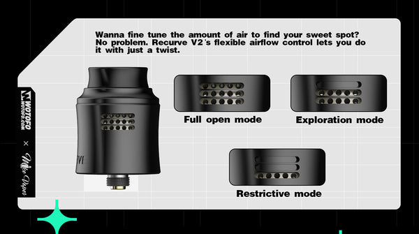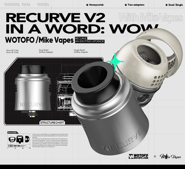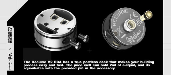 نقدم لكم أحدث تعاون بين Wotofo ومايك فيب، وهو Recurve V2 RDA، وهو نسخة مطورة من Recurve الشهير سابقًا، بقطر 24.6 مم وارتفاع 35.55 مم مع طرف التنقيط. أما الغطاء العلوي لجسم RDA، فيرث الشكل المنحني للجيل الأول، وهو جذاب للغاية. صُمم لدعم كلٍّ من اللفائف المزدوجة بقطر داخلي 3 مم، واللفائف الفردية بقطر داخلي 5 مم/3 مم، مما يوفر لك أدوات لف سهلة الاستخدام لتركيبها بنفسك. كما يتضمن شريطين قطنيين بسمك 3 مم، وشريطًا قطنيًا واحدًا بسمك 5 مم، يُوضعان في منفذي الفتيل الكبيرين، أحدهما على كل جانب من جوانب السطح. يتسع وعاء العصير لسائل تبخير سعة 2 مل، بالإضافة إلى مدخلي هواء جانبيين بفتحات مختلفة الحجم. كما يتضمن محولين لتدفق الهواء لتعزيز النكهة. يعمل مزيج الفتحة وقرص العسل على تليين تدفق الهواء بسلاسة ويوجهه مباشرة إلى ملف التسخين، ويخلطه مع السائل الإلكتروني المتبخر في الحجرة المخفضة التي يشكلها المحول، ويرسل البخار المنكه إلى فمك. توجد مساحة كافية على جانبي القسم المربع لأرجل الملف، ويحتوي على بعض الأدوات الرائعة لتتمكن من إعادة بناء كائناتك الفضائية المصنوعة يدويًا، ووفقًا لسطحه الخالي من الأعمدة، فهو سهل البناء ويمكن عصره باستخدام الدبوس المرفق في حقيبة الملحقات. بشكل عام، يتمتع بنكهة أفضل وأكثر ملاءمة من الملفات العادية نظرًا لكونه سهل التركيب.