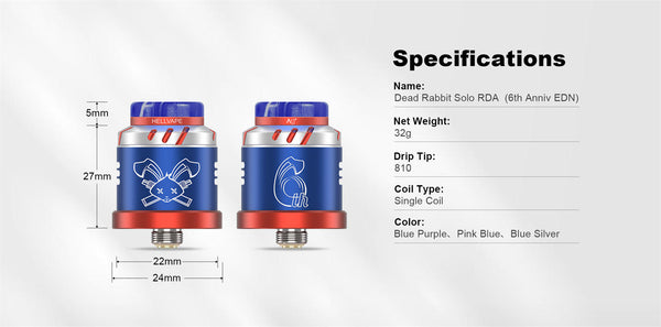 يتميز جهاز Hellvape DEAD Rabbit Solo RDA بقطر 22 مم، وقاعدة ملف واحد، ومدخل تدفق هواء 30 قرص عسل، وهو مناسب جدًا لمحبي التحكم في تدفق الهواء من خلال حلقة تدفق الهواء. توجد حلقة التحكم المرنة في تدفق الهواء على الجانب، مما يتيح لك التبديل من RDL إلى MTL. وهو مزود بطرف تنقيط من الراتنج بلون 810 ومحول 510 (موصل مع أطراف التنقيط 510). مع دبوس BF Squonk، يكفي جهاز Dead Rabbit Solo RDA لاستيعاب أي جهاز Squonk تقريبًا، مثل جهاز Wotofo Profile وجهاز Vandy Vape Pulse V2 BF، إلخ.