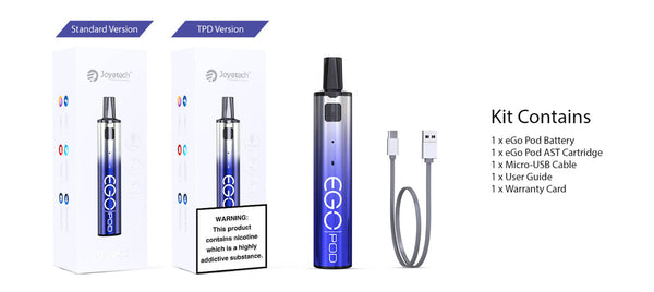 Joyetech eGo Pod Kit AST Version is a perfect starter kit. It features no button, no adjustment for easy of use. The coil is improved with the AST steel, aiming to achieve the boosting flavor and long-time use. The super austenitic stainless steel (AST steel) supports longer life-span and produces greater flavor than ever. The AST steel is coupled with innovative directional airflow, which guarantees you super boosting flavor and throat-hit. Powered by built-in 1000mAh battery, Joyetech eGo Pod AST Version Kit can provide constant voltage output with Avatar IC 1.0 chip. The AST eGo Pod Cartridge has 2ml capacity, adopts convenient side fill. It is easy and leakage free.