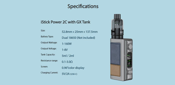 It has inherited classic leather with its comfortable touch in your hand. as long as two changeable 18650 batteries (not included), which is why it is the most popular with vapers who want the power support and enduring vaping experience. iStick Power 2 can reach a maximum of 80W output, on the other side, iStick Power 2C can serve your vaping with 160W maximum output, both of them are able to deliver the ultimate vapor and tightness of the flavor. Optimized for its easy-to-use SMART mode and the adjustable VOLTAGE mode, it has the responsibility to automatically identify the best and most suitable power/voltage once you replace your new coil. Aside from that, it is equipped with the 2A fast charging setting and a USB type-c charging port. Not only prolongs the service life for your device but also shortens the waiting time.