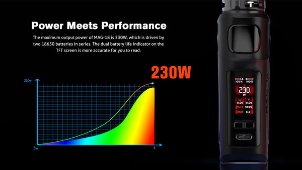 The Mag-18 has a maximum power of 230W from dual 18650 batteries accessible by way of a bottom cap.(bypass mode, variable wattage mode, TC mode,) The cells can be recharged...