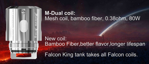 A bobina M1 Falcon tem uma resistência de 0,15 ohms, enquanto a bobina M2 tem uma resistência de 0,16 ohms. Ambas utilizam bobinas de malha para melhor acomodar a potência excepcional que as atravessa. Os elementos condutores de líquido das bobinas M1 e M2 são compostos por uma mistura de 70% algodão e 30% polpa de madeira.