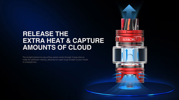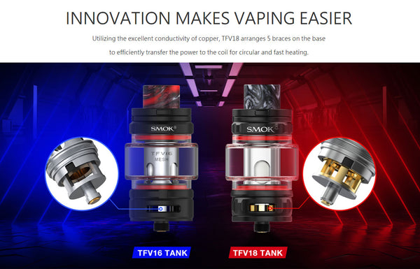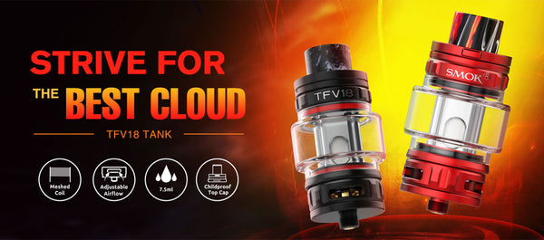Smok TFV18 possui capacidade para 7,5 mL e 32 mm de diâmetro. O tanque sub-ohm TFV18 apresenta duas novas resistências: uma de malha simples de 0,33 Ω e outra de malha dupla de 0,15 Ω, mantendo a compatibilidade com todas as resistências de malha do TFV16. Construído em aço inoxidável durável e com capacidade para até 7,5 mL de e-líquido dentro do vidro bolha, o tanque permite que o usuário não precise se preocupar tanto com reabastecimentos frequentes. As resistências são instaladas no estilo "plug and play", tornando a troca rápida, simples e sem sujeira. Com entradas de ar duplas na parte inferior, totalmente fecháveis, o tanque TFV18 permite vaporização MTL (boca-a-pulmão) ou DL (direto para o pulmão).