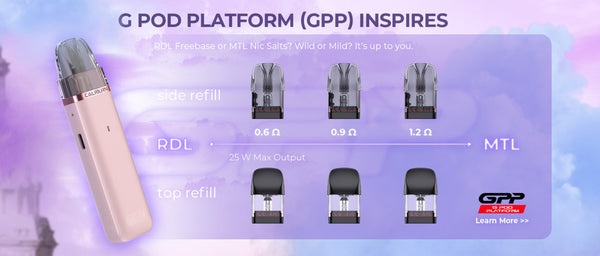 Especificações do cartucho: Cartucho de bobina integrada Caliburn G3 de 0,6 ohm com malha FeCrAl (recarga lateral) (INT./FDA), Cartucho de bobina integrada Caliburn G3 de 0,9 ohm com malha FeCrAl (recarga superior) (TPD)