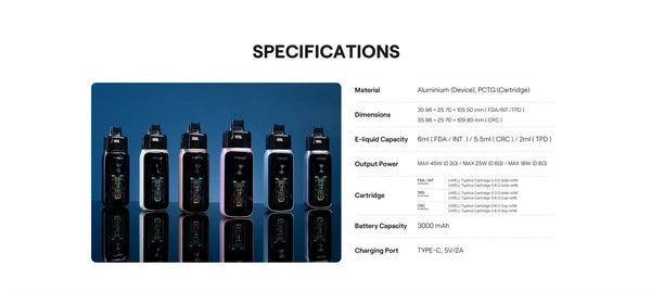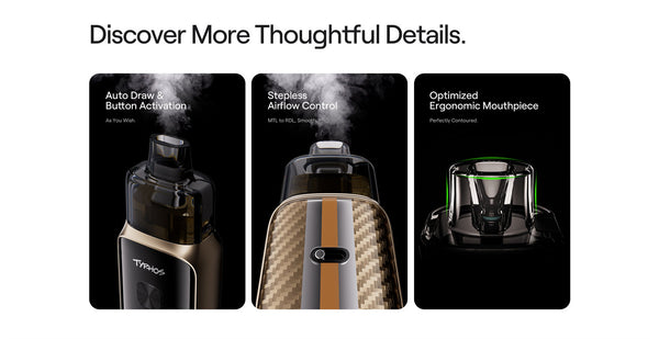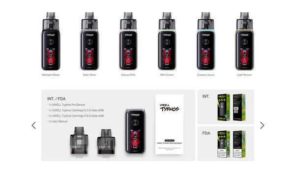 O kit Uwell Typhos Pro Pod System combina durabilidade, desempenho e estilo em um dispositivo compacto. Com uma bateria integrada de alta capacidade de 3000mAh e potência máxima de até 45W, ele oferece energia de longa duração para sessões de vaporização diárias e intensivas. A tela colorida HD de 1,47 polegadas traz temas de interface dinâmicos e dados em tempo real ao alcance dos seus dedos, enquanto o sistema Pod System é compatível com todos os cartuchos da família Typhos. Com a tecnologia anti-vazamento CoreShield™, fluxo de ar ajustável de MTL a RDL e um corpo premium em liga de alumínio, o Typhos Pro foi projetado para uma vaporização confiável e rica em sabor com manutenção mínima.